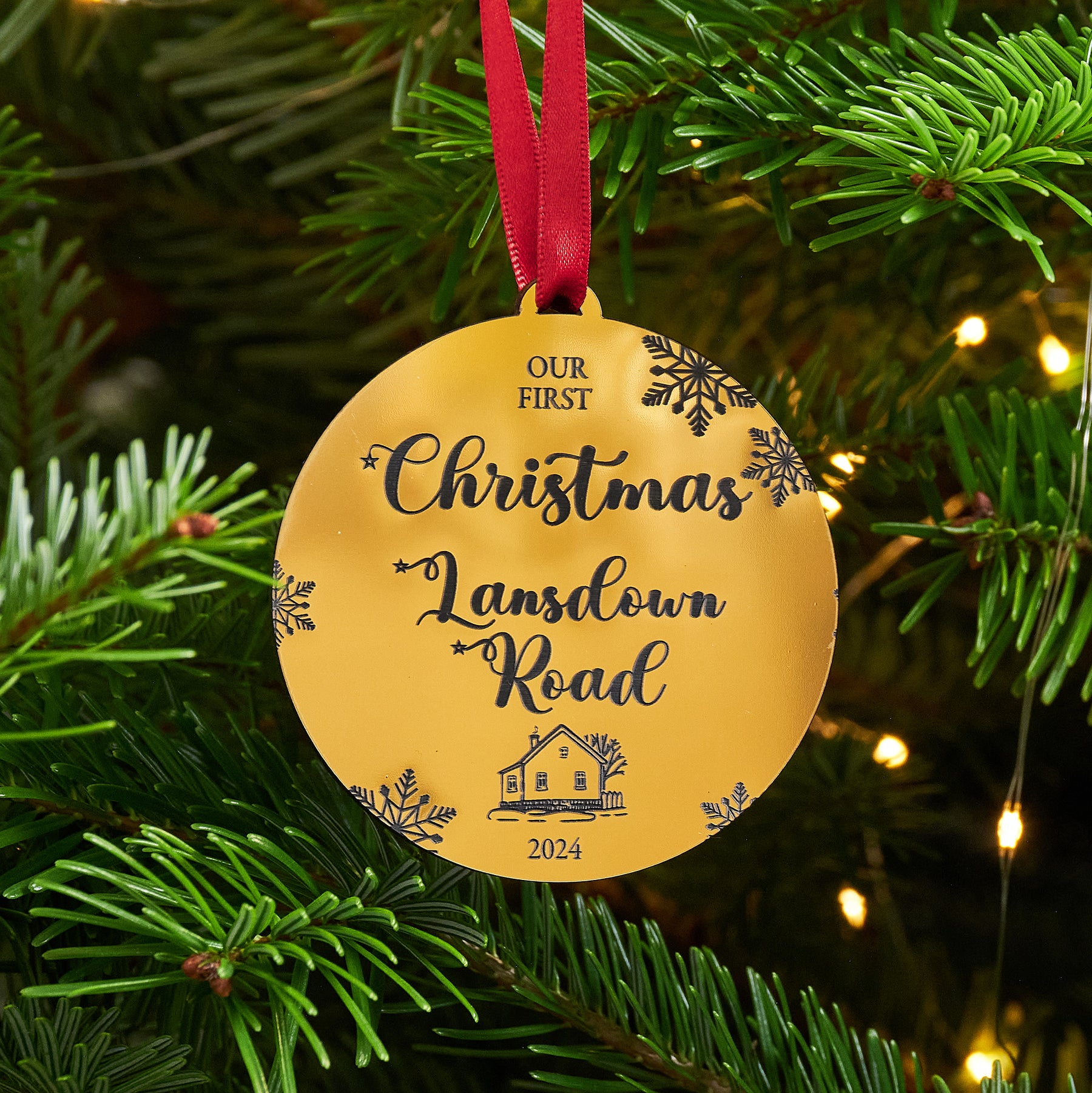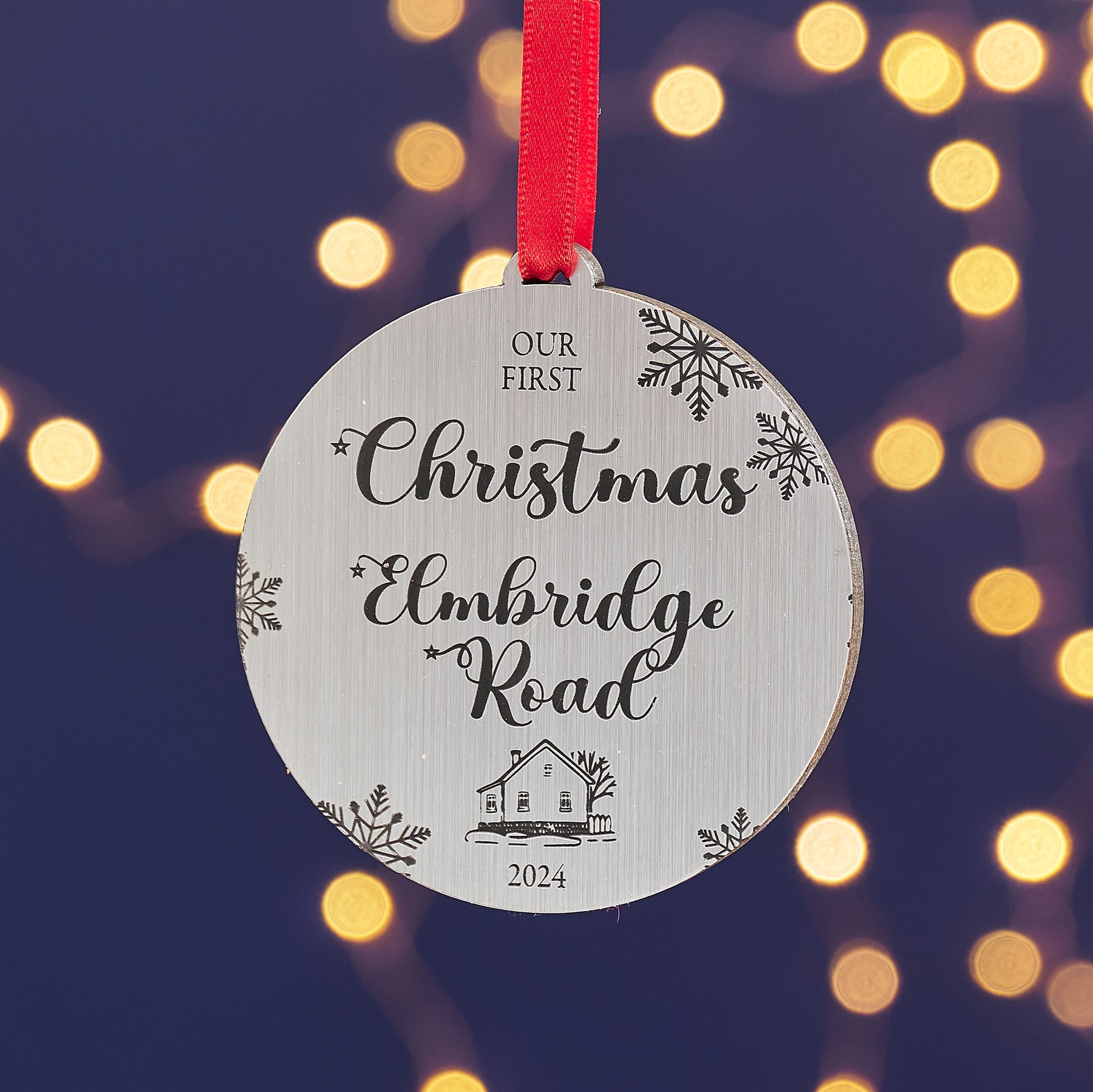 Celebrate a first Christmas in a new home with this beautiful silver or gold personalised Christmas tree bauble. The perfect gift for new home owners or your new neighbours!