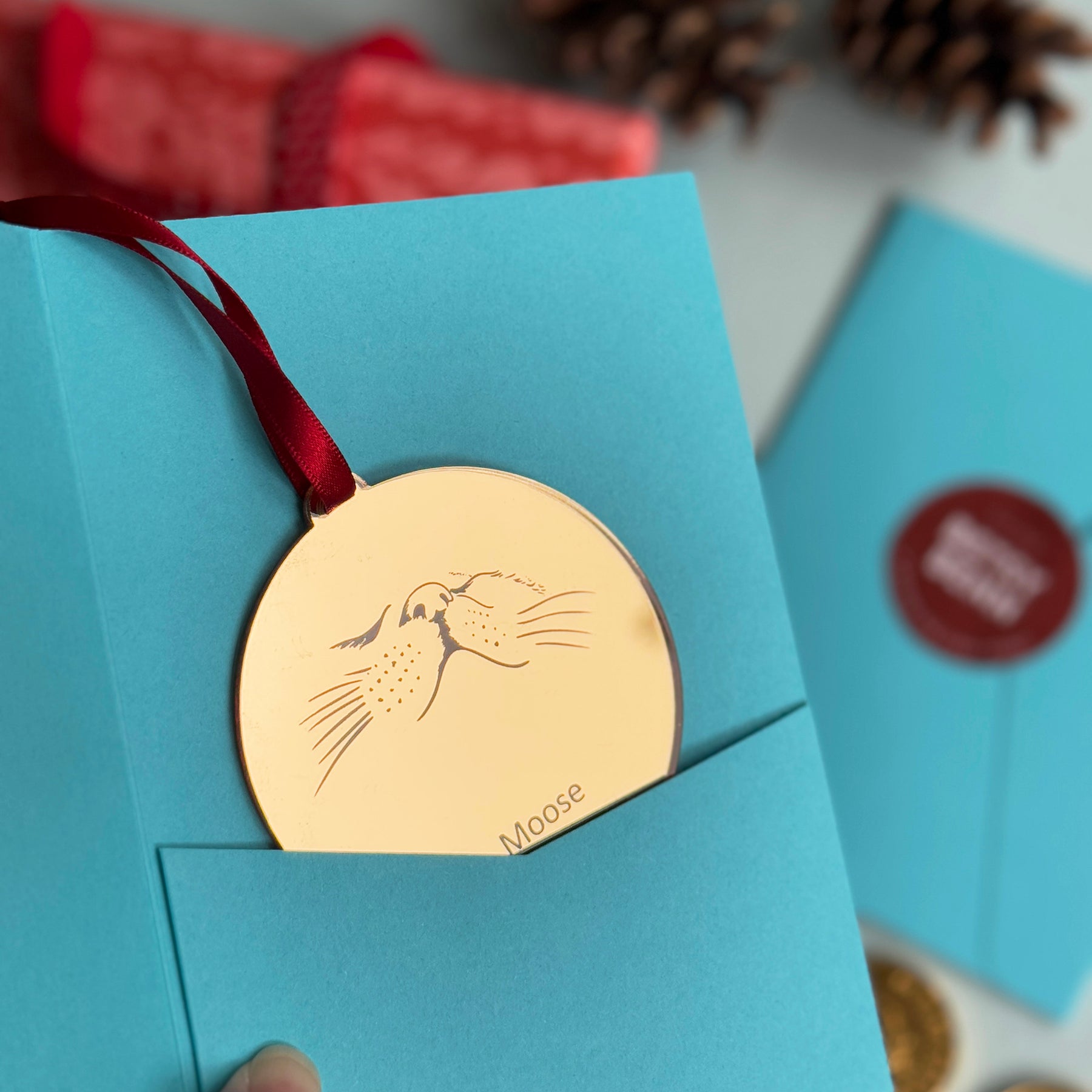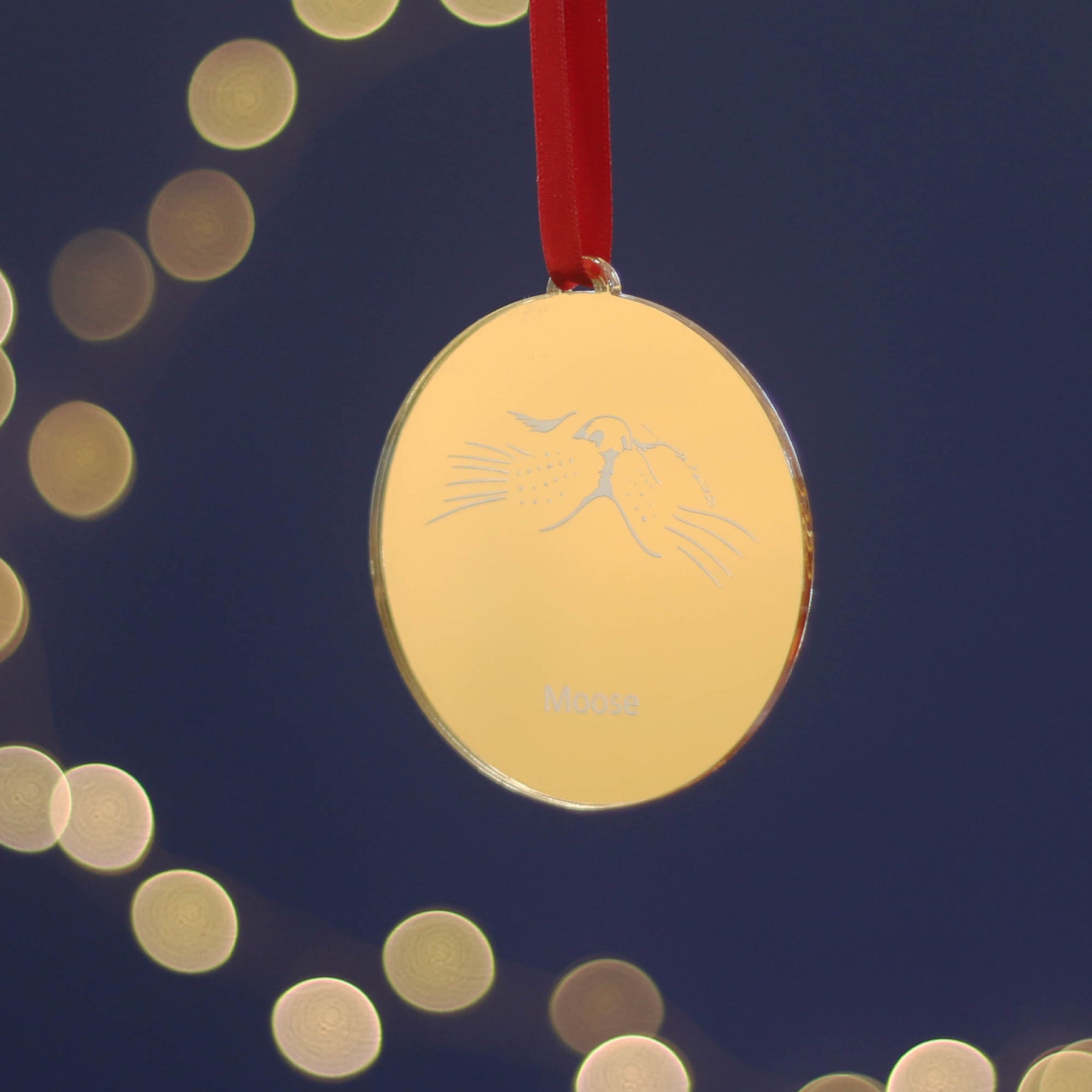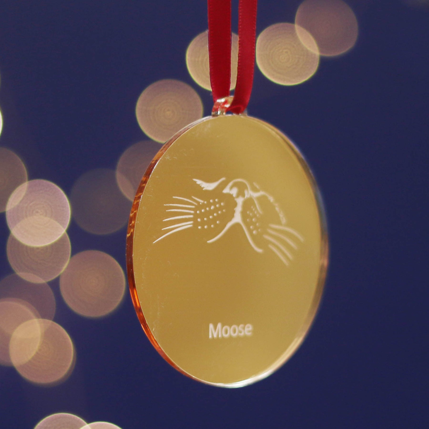 Engraved with a minimalist nose and whisker design and finished with a red satin ribbon, this decoration sparkles beautifully on the Christmas tree.