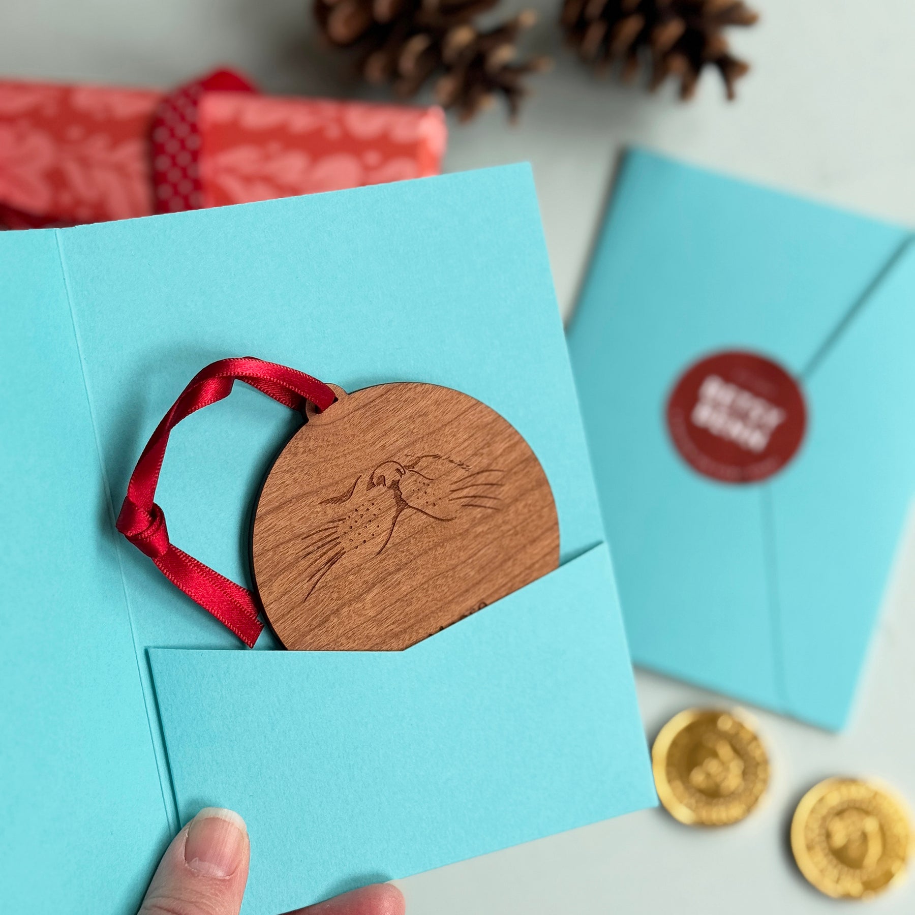 Laser-engraved onto beautiful cherry wood veneer, this round bauble could represent any cat breed, making it the perfect Christmas ornament for all cat lovers. Finished with a red satin ribbon, it’s both simple and meaningful.