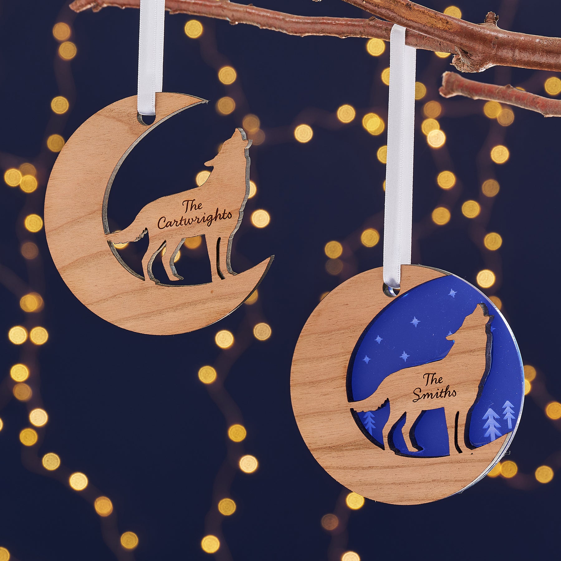 We can engrave any name on the wolf and when hanging, the light shines through the frosted acrylic making a very snowy and misty feeling Christmas bauble for your tree.