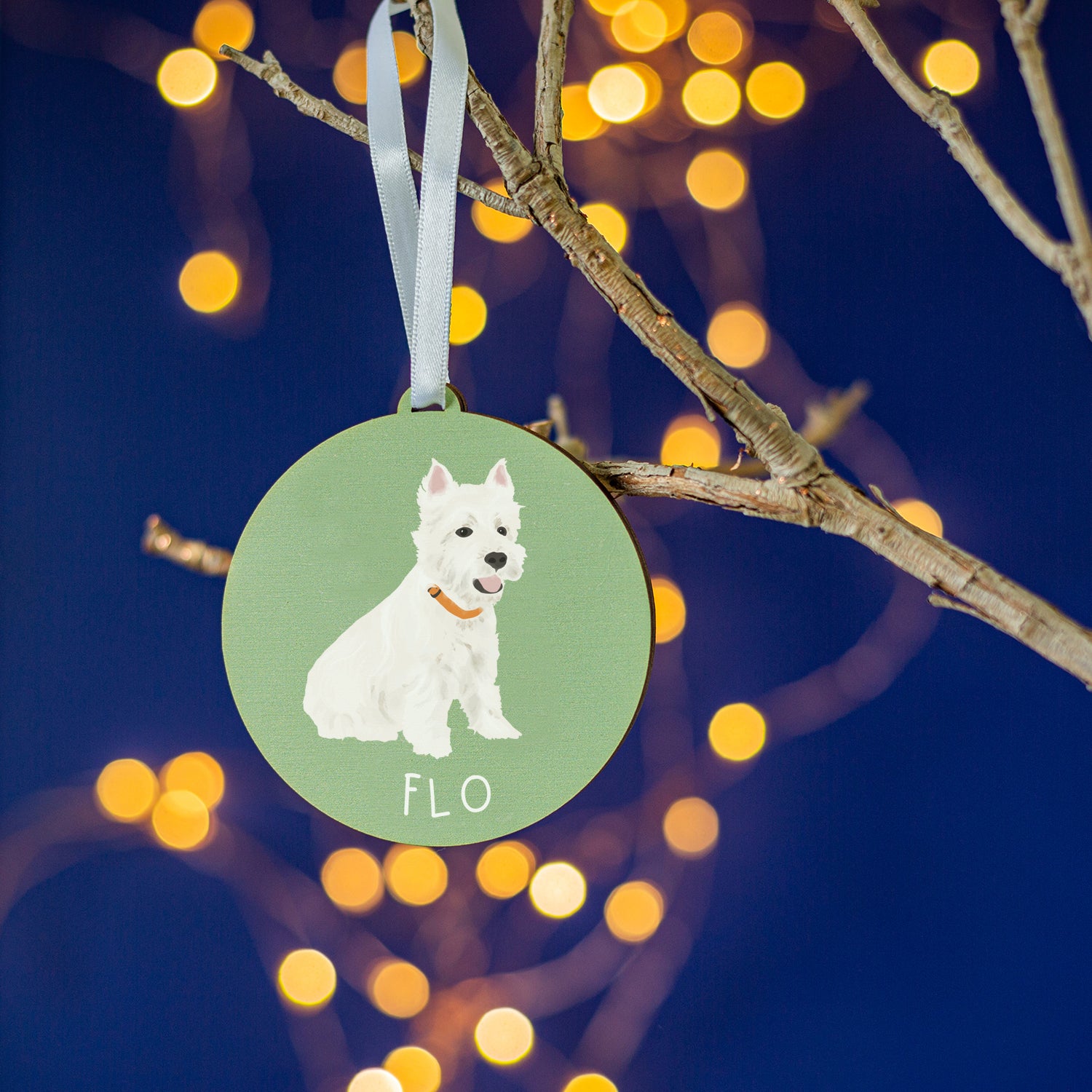 Cheerful and fun-loving, the Westie, with his beautiful white coat, is celebrated on this gorgeous personalised Christmas tree decoration.