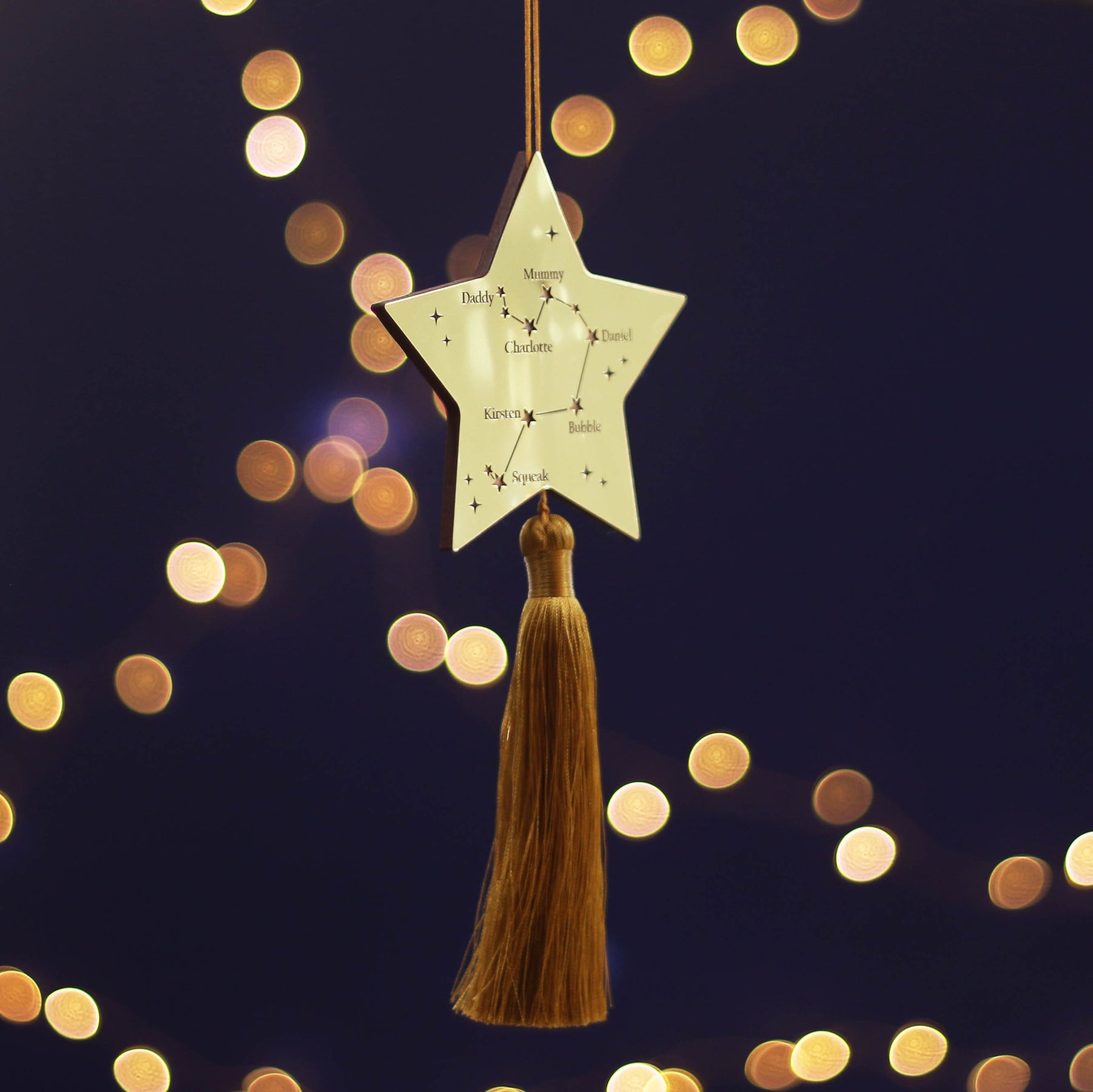 These family constellation Christmas decorations are made exclusively by Betsy Benn from a sustainably sourced cherry wood veneer and qold acrylic. Finished with a golden tassel for extra sass.