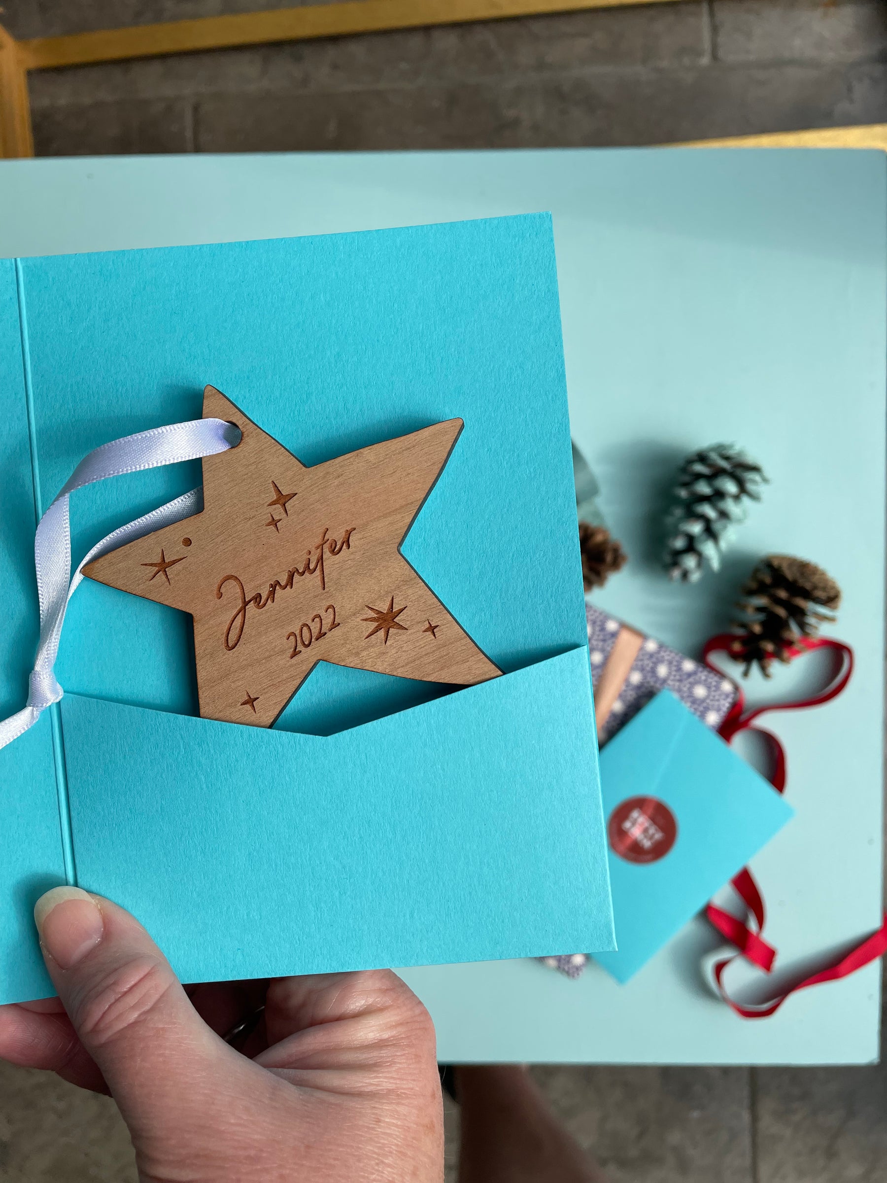 So, we designed the perfect way to display the gifts that you create! An initial of your choice, cut from sustainably sourced printed cherry veneer wood, with an array of cut out stars. Towards the bottom, there are more than enough stars from which to hang 24 (or 25) small advent gifts.