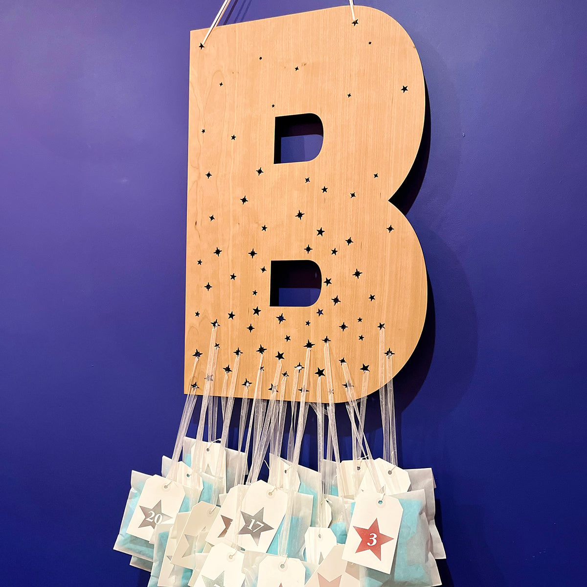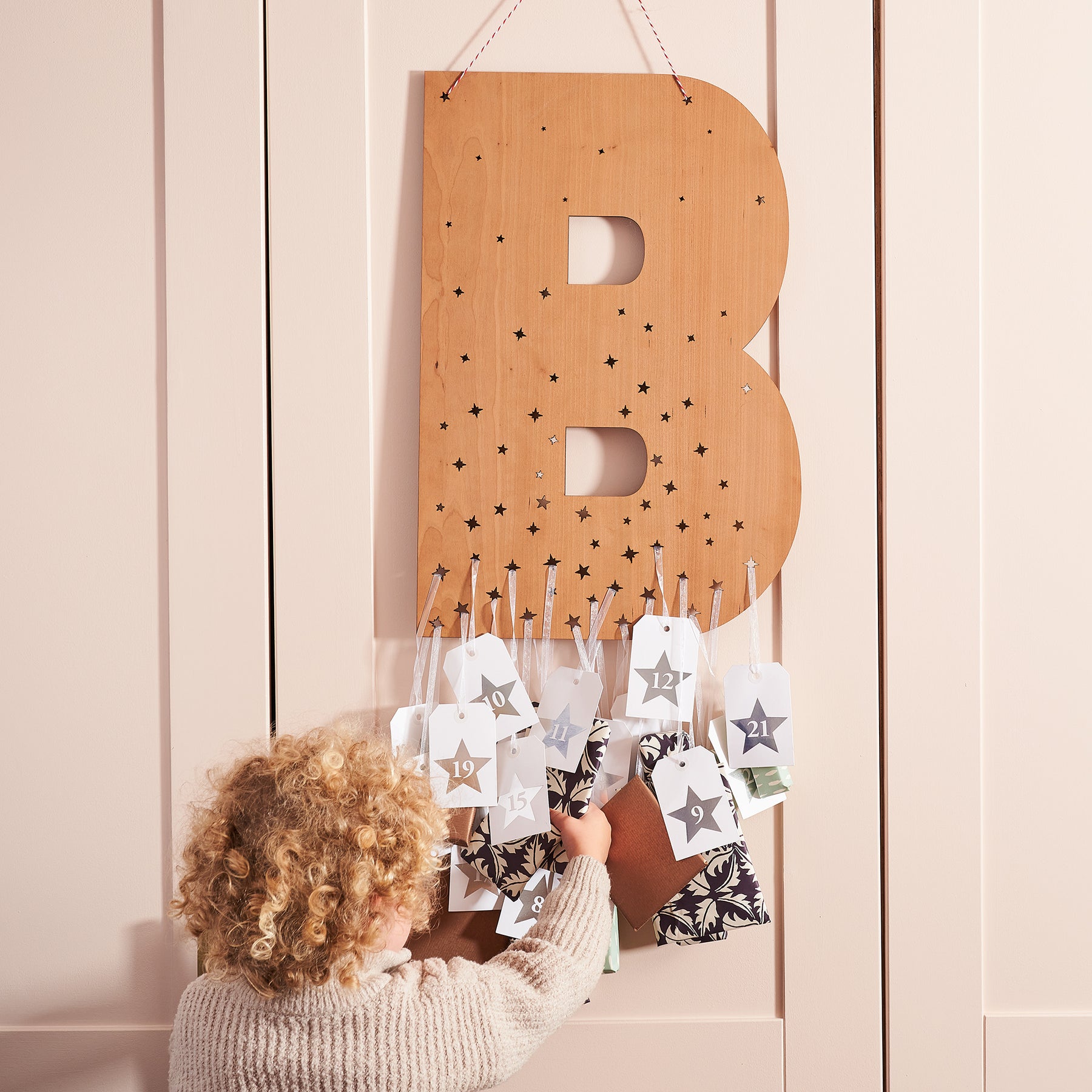 An initial of your choice, cut from sustainably sourced cherry veneer wood, with an array of stars. Towards the bottom, there are more than enough stars from which to hang 24 or 25 small advent gifts. At the top there are two stars, strung with ribbon, to hang your advent calendar on the wall.