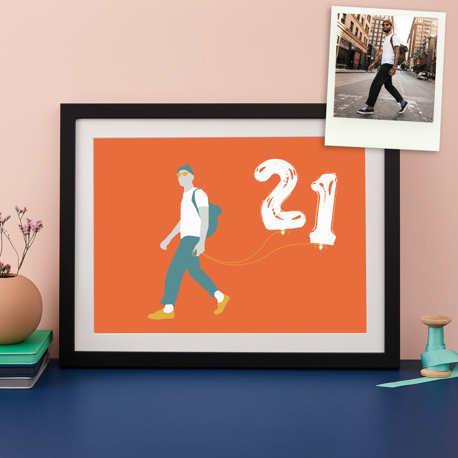 Looking for the best 21st birthday gift ever? We've got you covered. Our modern silhouette prints are created using your own photograph as a starting point and we'll add a silhouette of large helium style age balloons to mark the milestone birthday!