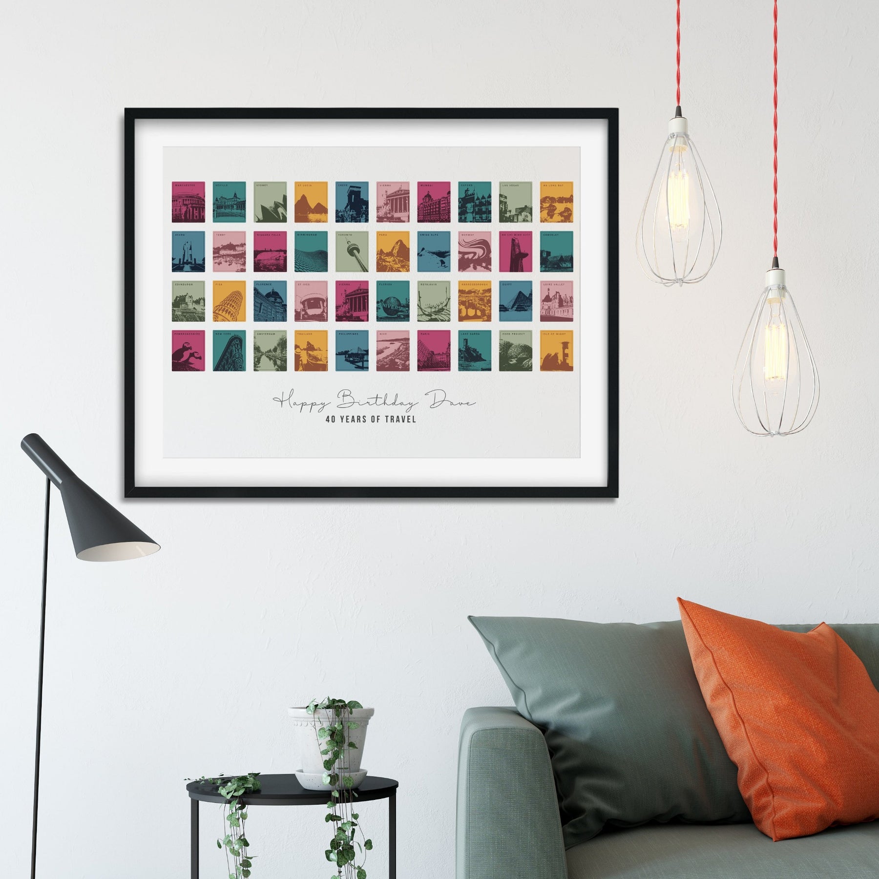 A gorgeous and colourful travel print to capture 40 of your most favourite places in the world. The perfect gift for a 40th birthday or anniversary.