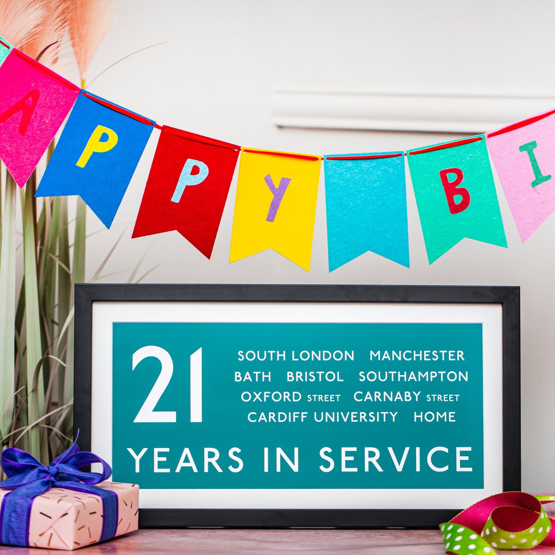 Our 21st birthday destination print measures 29x54cm approx. as a framed print, or 21x46cm approx. as an unframed print.