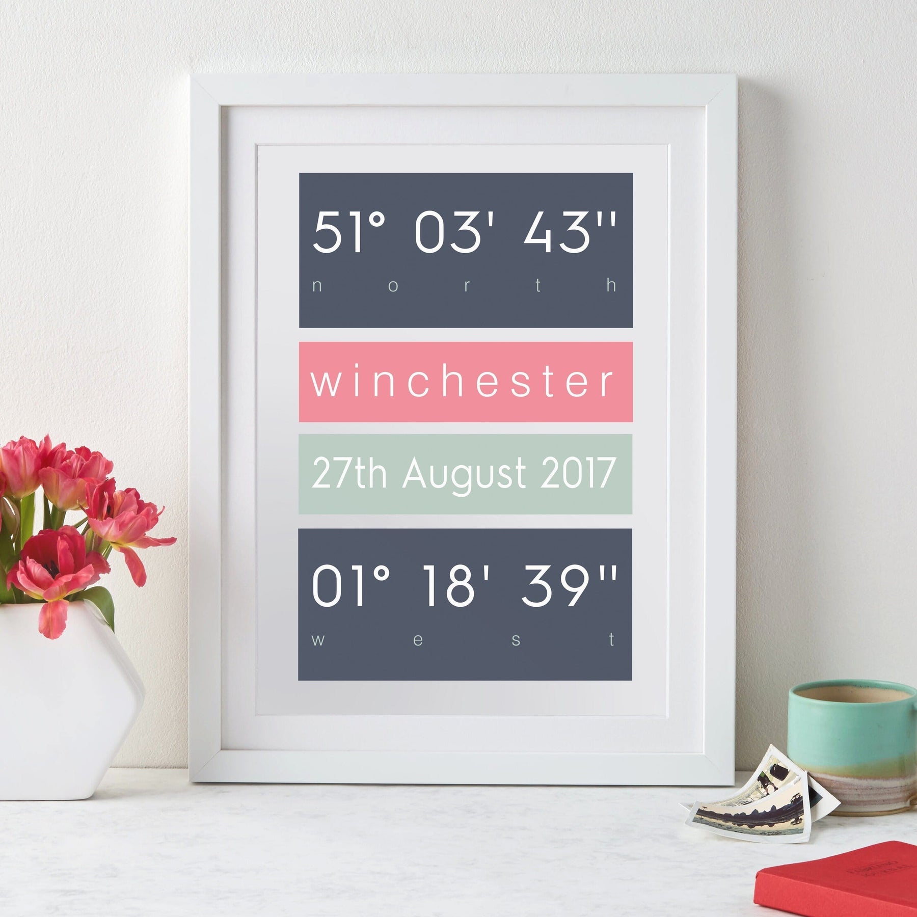 Our modern scandi-inspired design, featuring the DMS [degrees, minutes, seconds!] international coordinates, is a great way to remember any treasured location in the world. Simply enter the location details that you know - it could just be a town, maybe Barcelona for example, - or a street address and post code. We'll find and use the correct coordiantes when we design your bespoke print.