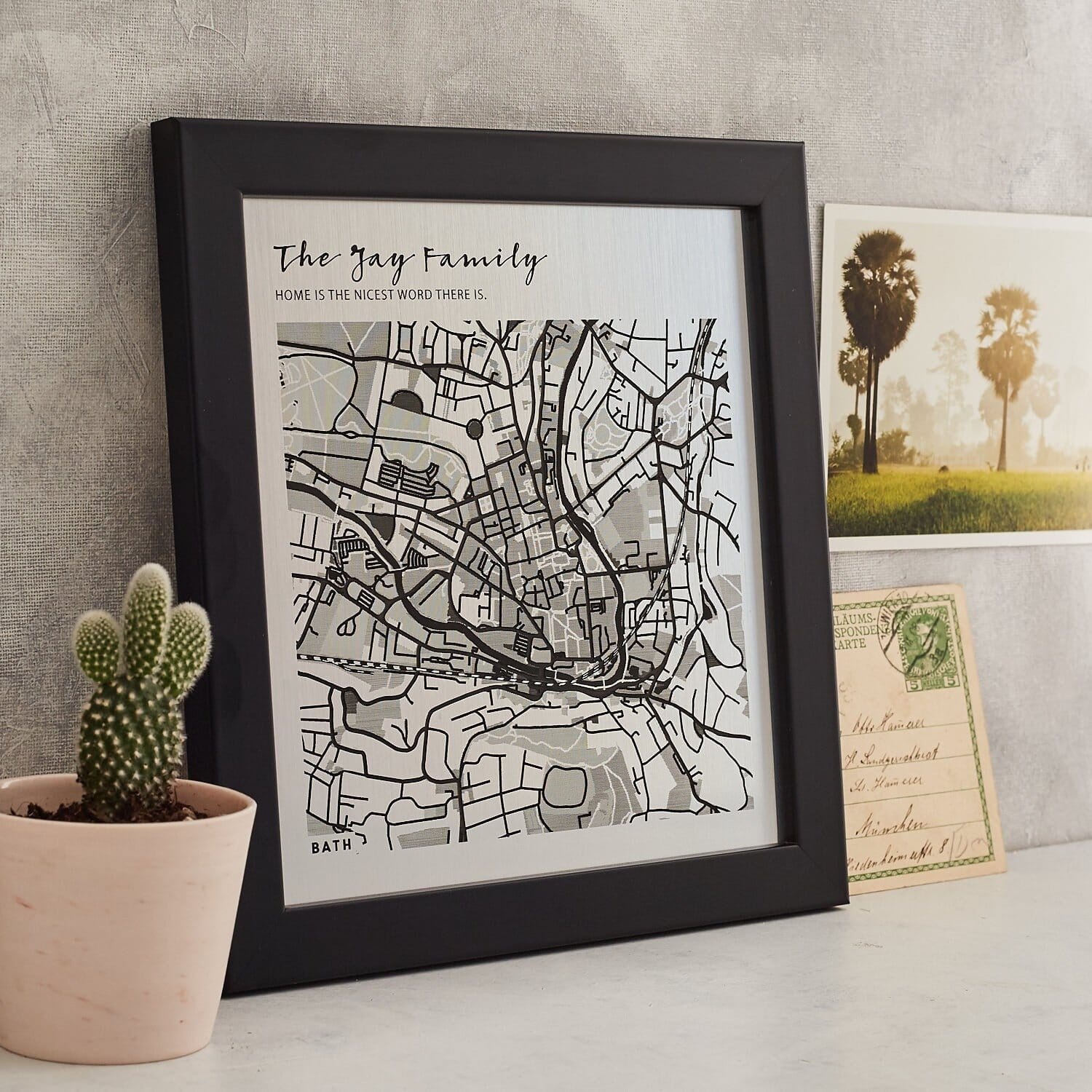 The finished framed size of our metallic map print is 21.5cm x 22.5cm