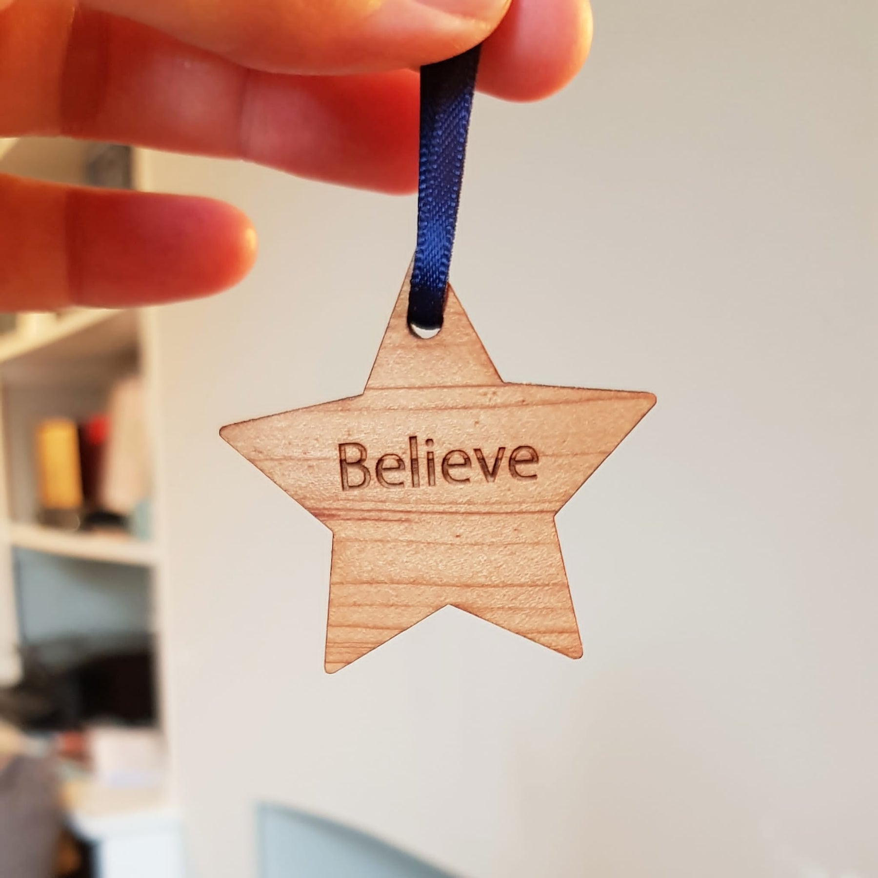 We've found a great and sustainably sourced cherry wood veneer for this powerful wooden star from some wonderful timber merchants practically on our doorstep. It means we can keep our carbon footprint low which is really important to us. The word star is finished with some navy satin ribbon so is ready to hang in any special place.