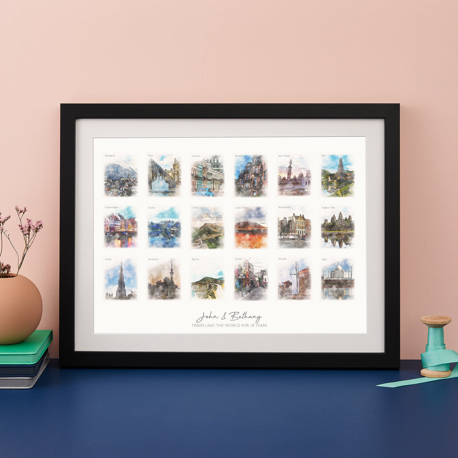 Featuring eighteen of your most treasured locations, this personalised travel memories print would make the ideal gift for the well-travelled 18-year-old on that big birthday! Or if you know a couple that has spent 18 years together, exploring and adventuring, this will bring back all the memories they hold dear. Such a unique gift and to be loved for a lifetime.