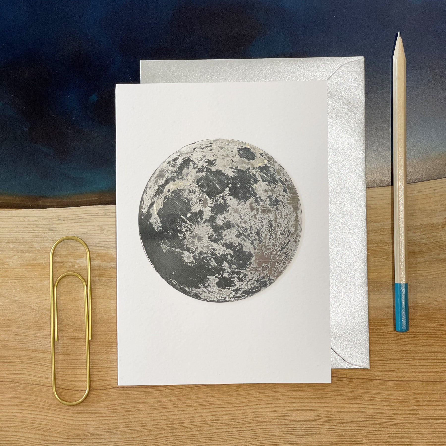 The moon is engraved on to a metallic coated acyrlic and adhered to a snowy white, thick, textured card - 280 gsm. FSC Approved.
