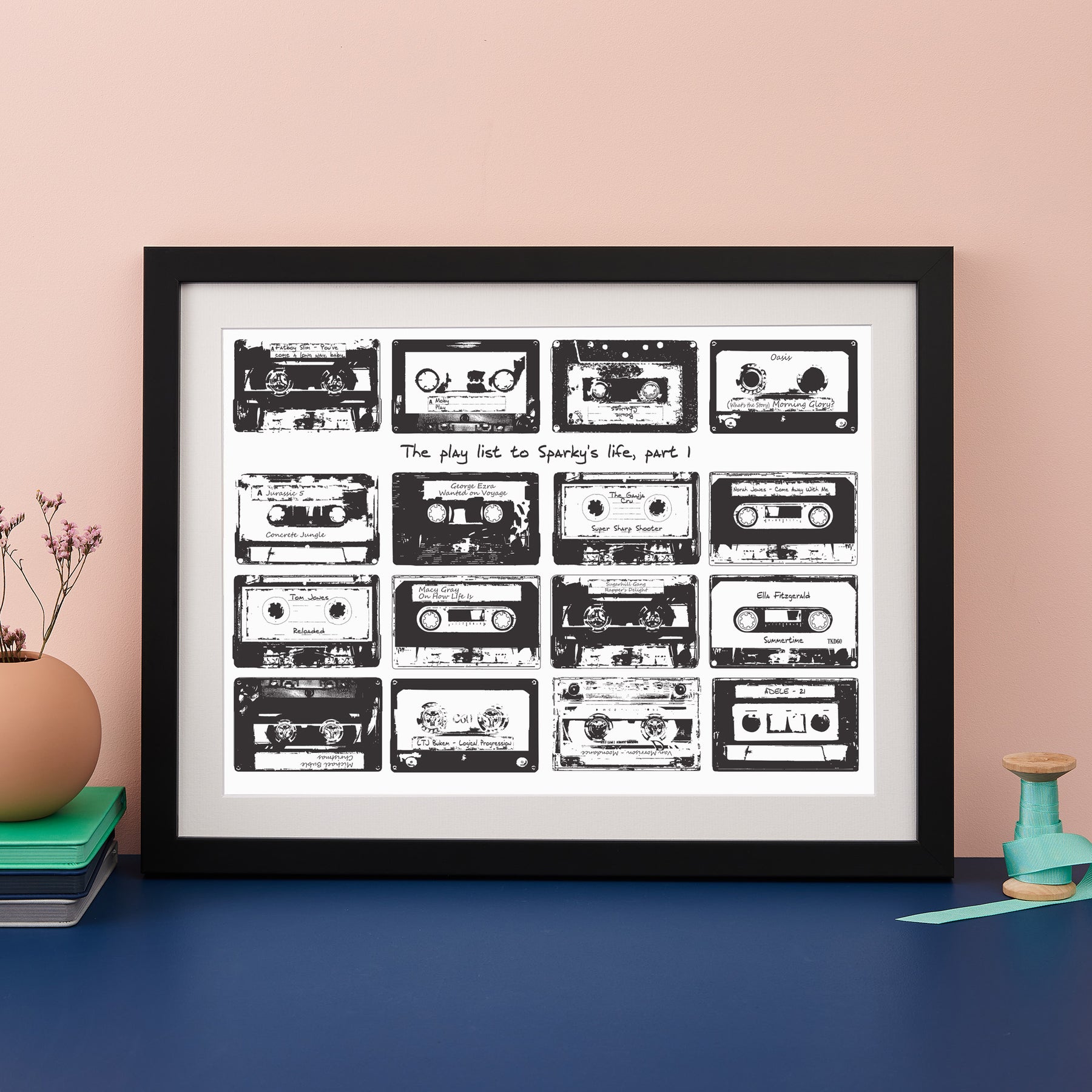 Whether it's your wedding playlist, the driving tracks you can't travel without, or the theme music to your life, this print is for you! Capture all your special songs on our personalised Retro Cassette Playlist print.