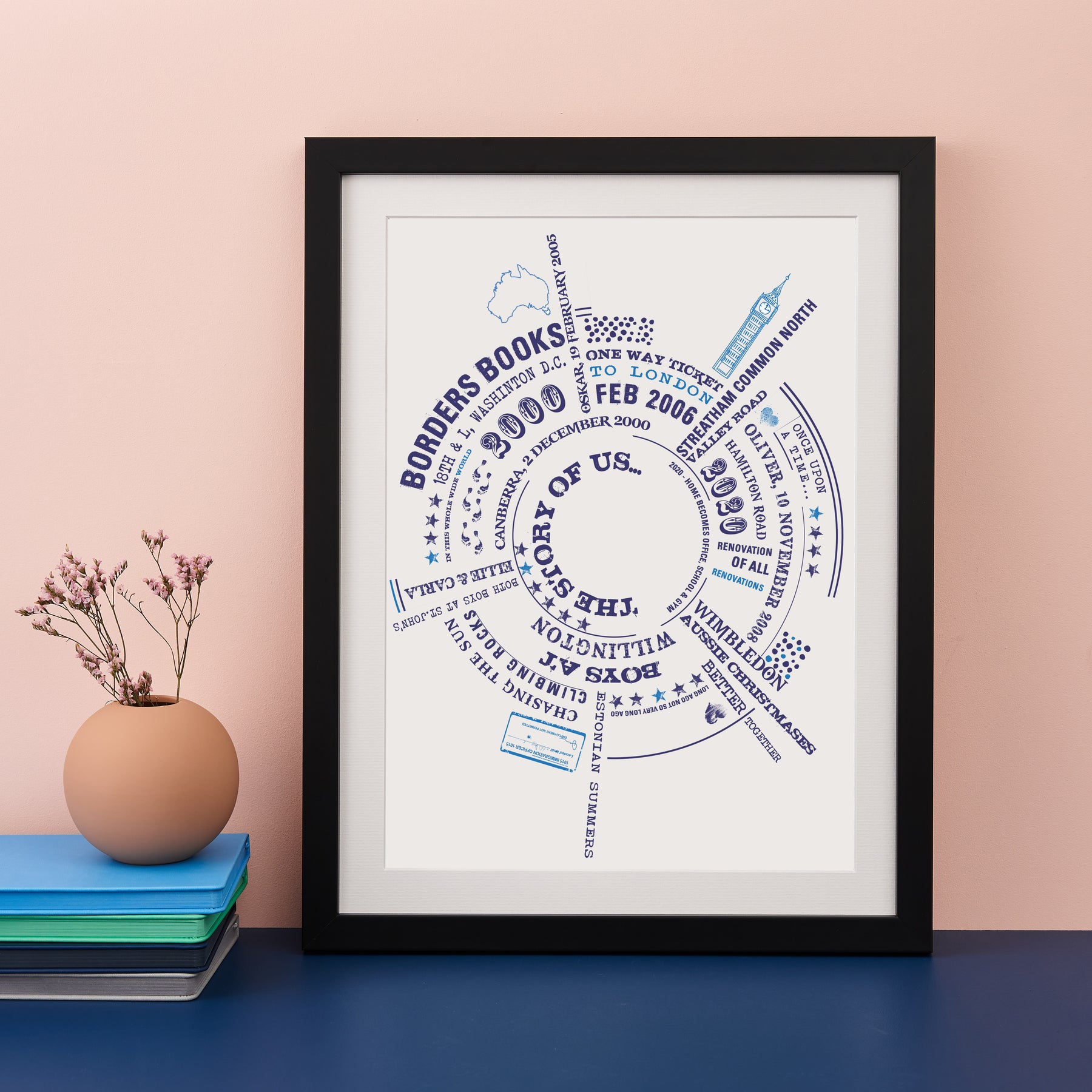 Tell the story of your life together with your own chapter headings. You can list your home towns, favourite holidays, places with special meaning, children's names, private jokes, where you fell in love, where you have lived - anything is possible. A fantastic piece of statement art and an amazing conversation starter.