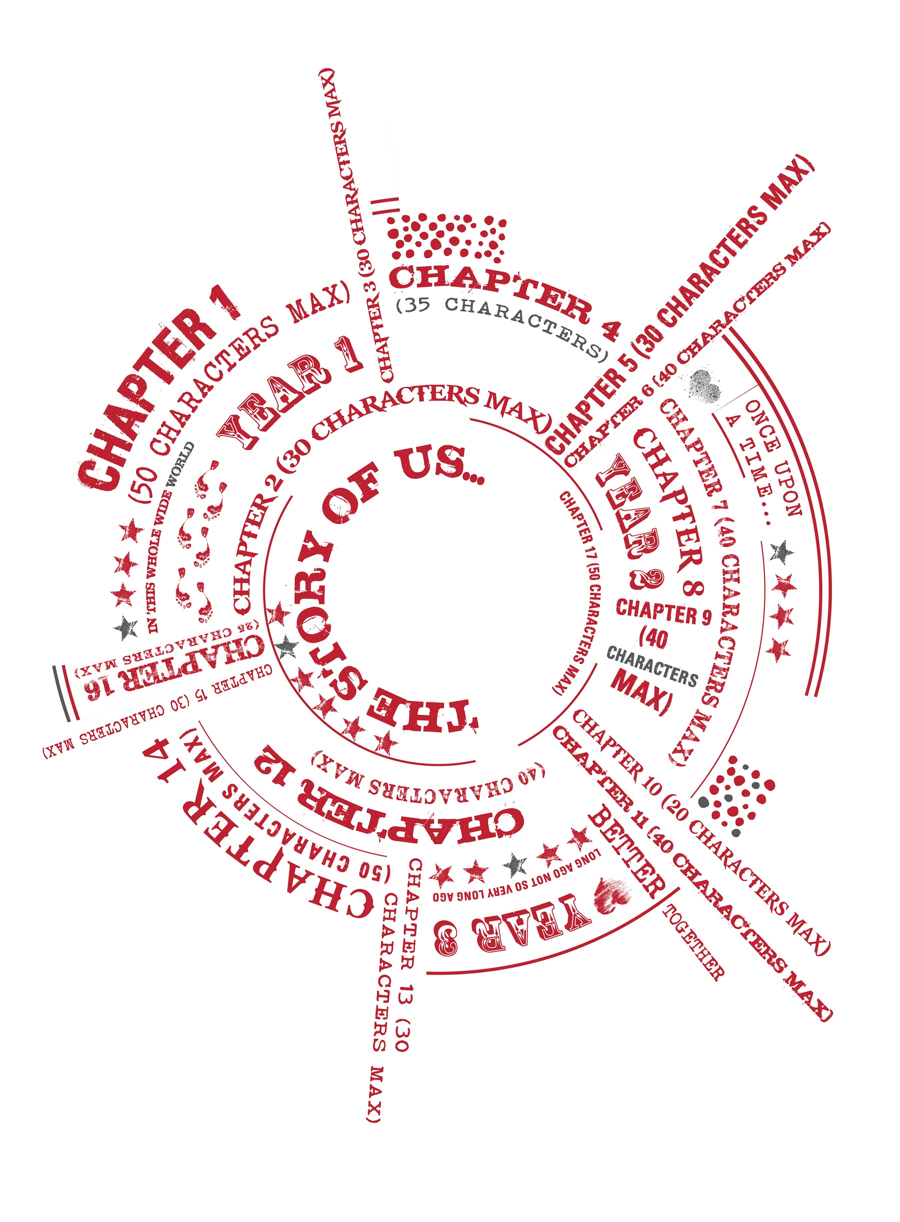 To give the print some structure, we have created a skeleton template (see images above) which shows where each question/chapter heading will appear in the design. Please have a look at this to get the most out of your print's design.There are also some sections of generic text e.g. BETTER TOGETHER. These elements are fixed and give a permanent framework on which we build your story.