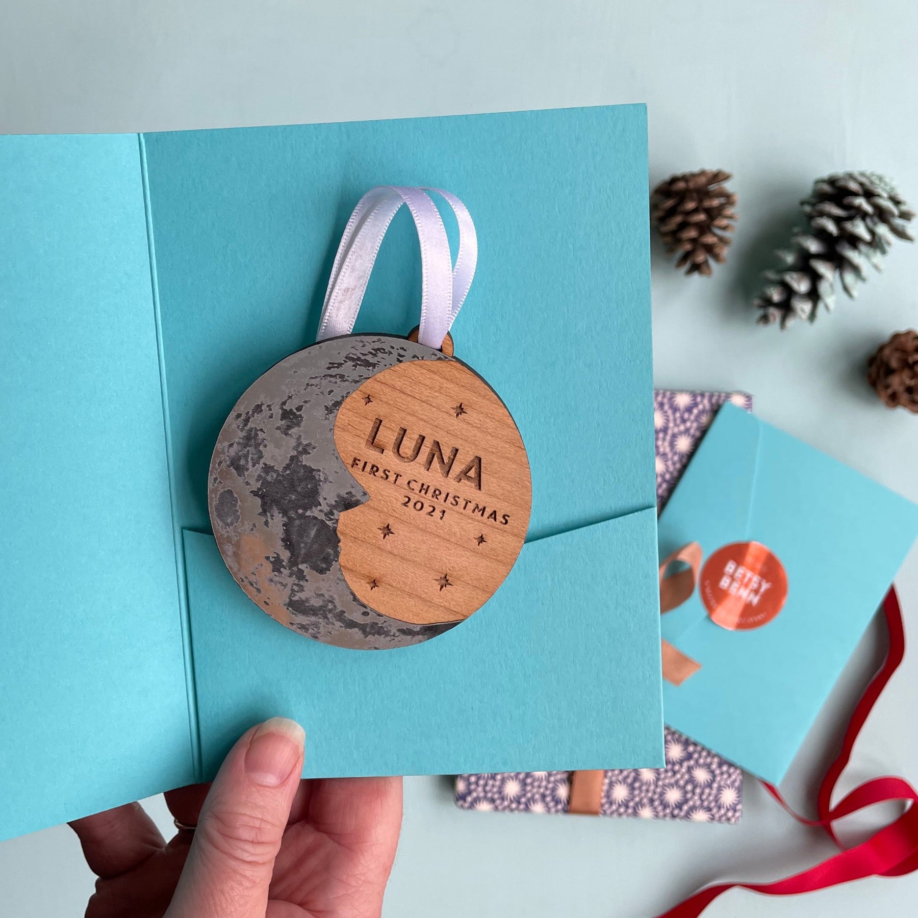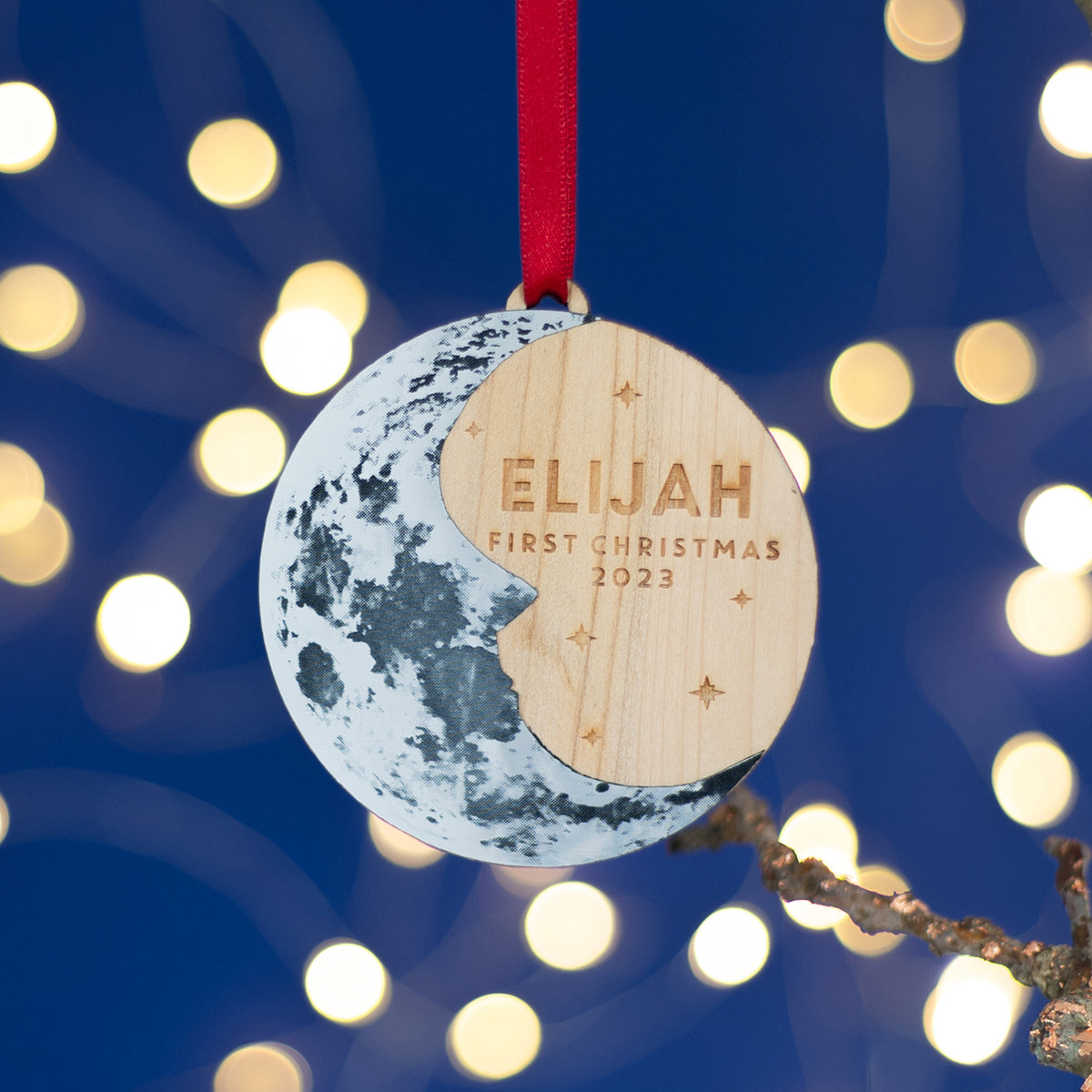 A beautiful keepsake bauble to celebrate baby's first Christmas, this moon themed Christmas tree decoration can be personalised with baby's name and their year of birth.