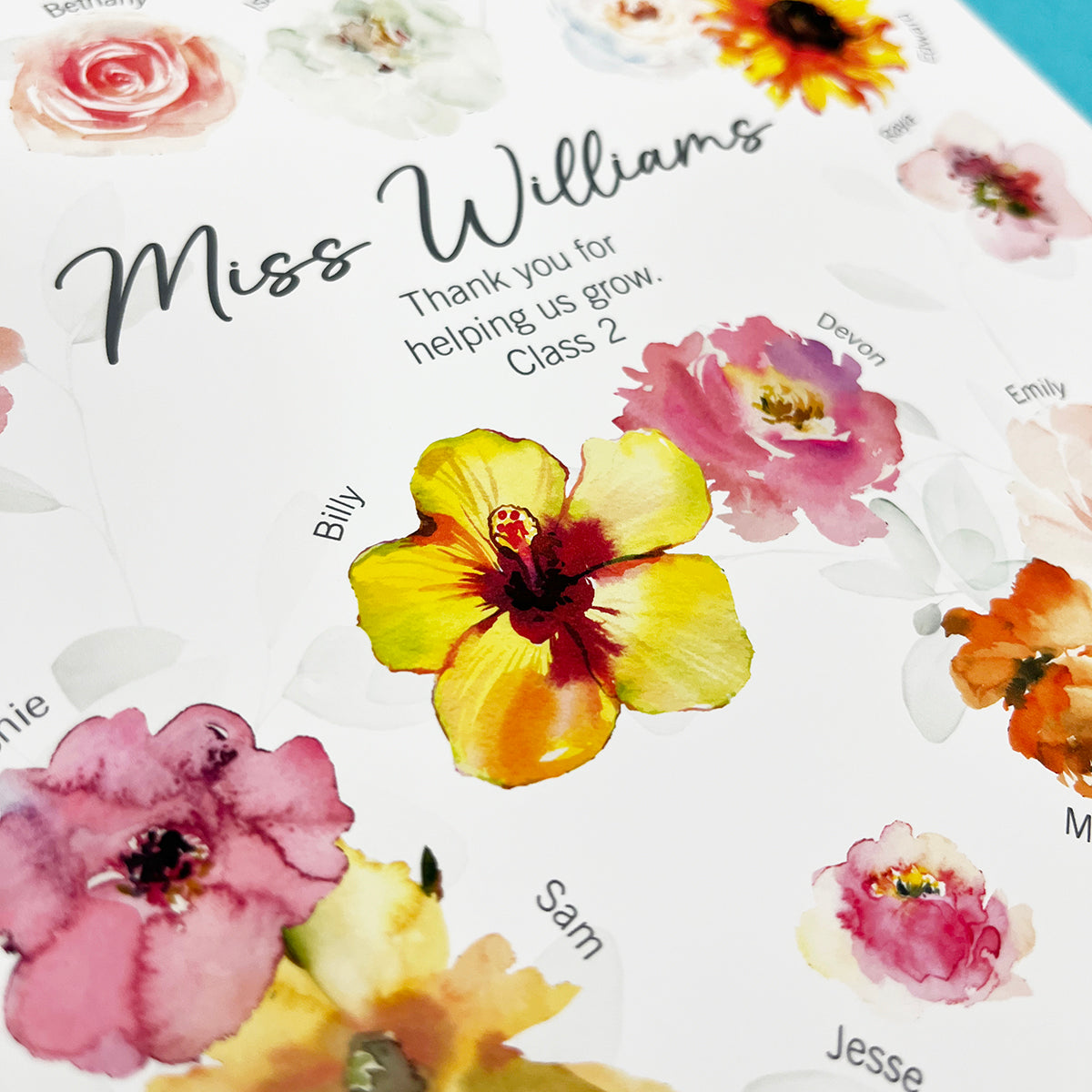 Featuring up to 33 watercolour illustrations of flowers, we can add a child's name to every flower to represent a whole class. What a way to show your favourite teacher how much they have helped the class grow and bloom.