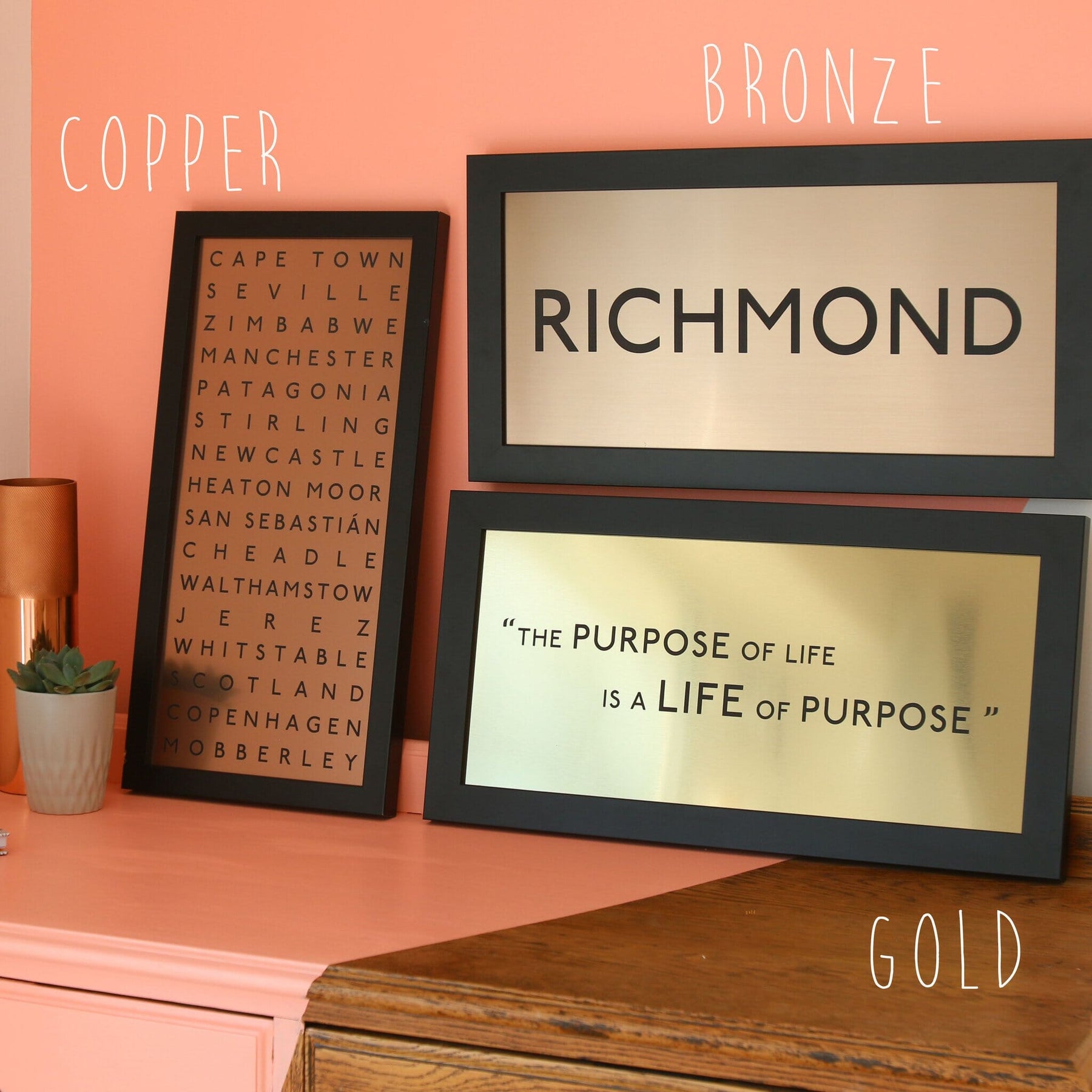 Choose from one of two font styles, Johnston Transport Type or Script Style, and from a fantastic range of metallic backgrounds - silver, gold, copper or bronze. A really up to date style statement whilst keeping a classic feel.